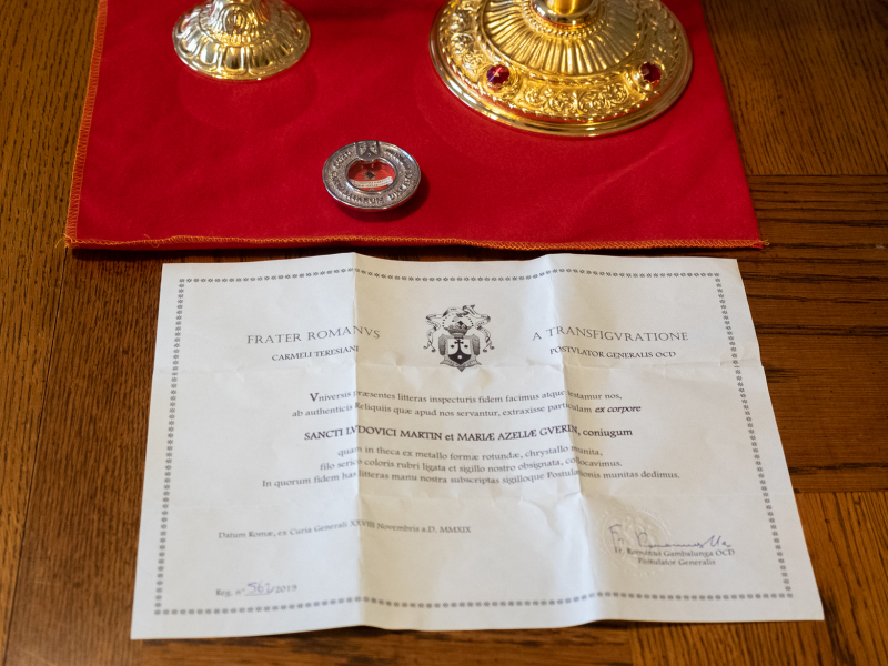 The two relics of the saintly spouses, which were previously in the possession of the Carmelite Order in Rome, were requested by Father Fain last year. They arrived in the United States late last month. They will now be housed in a special shrine along with a relic of their daughter, Saint Thérèse, which the parish already possesses.