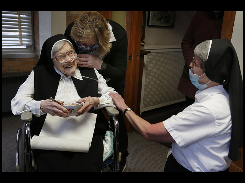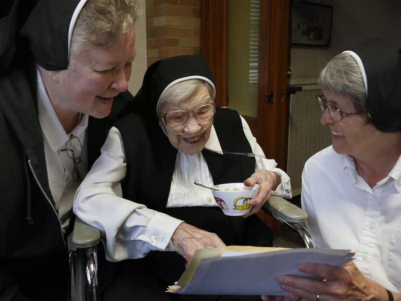 * Photographs below: Sister Agnette Bengal with Sister Anastasia Sanford (left) and Sister Monica Cormier (right) at the Sacred Heart Convent in Wilmette. Photo: Karen Callaway/Chicago Catholic