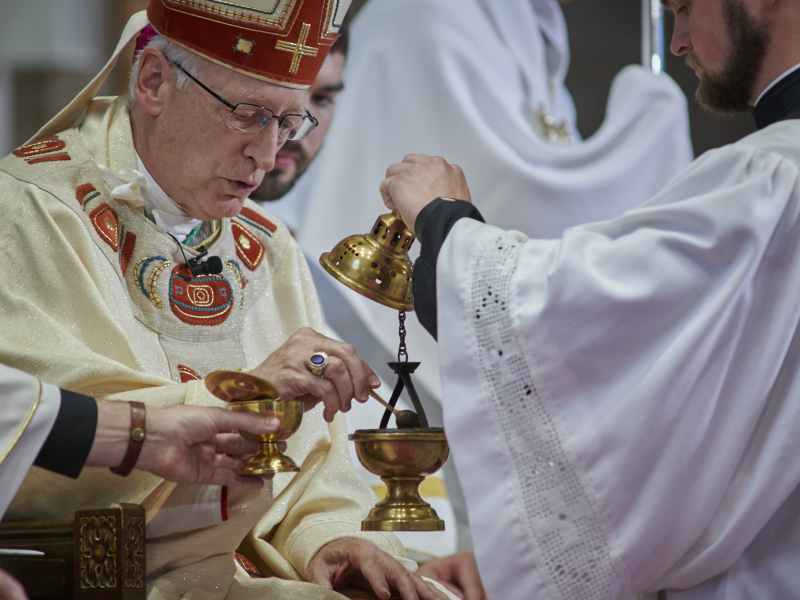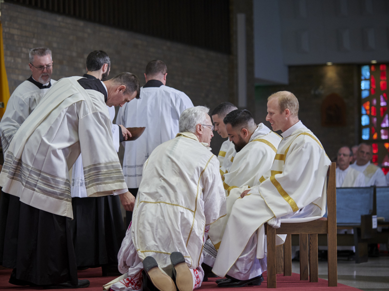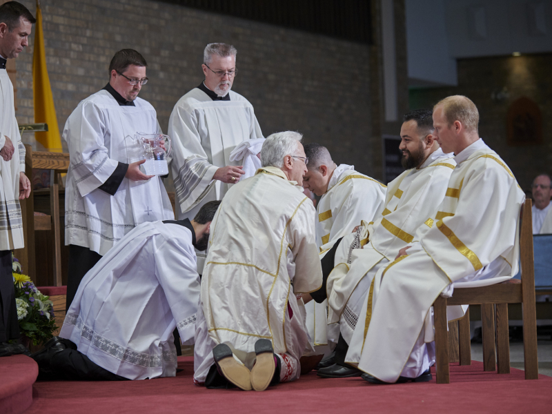 My sons and brothers, I have been struck by your choice of readings for today. They all focus on the need for the great virtue of humility. They challenge us to be like Jesus, to pour out ourselves as gift, not holding anything back, and then ascribing all to grace, to the love of the Father for us. You are thus committing yourselves to serve as models to all of us as you embrace the Cross of our Lord, Jesus Christ. May I this day, as a sinner myself, join you and thus imitate our Lord and also model this service to you as I wash your feet. God bless you all.