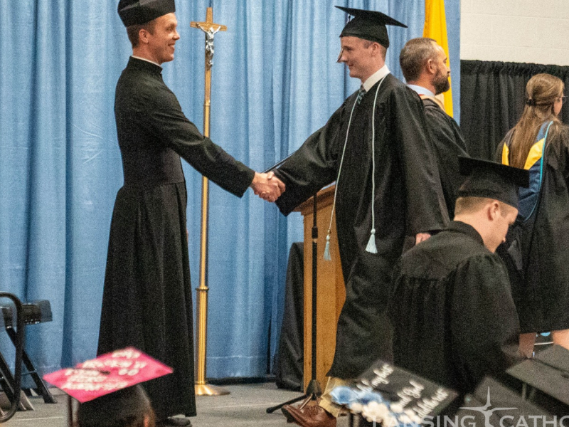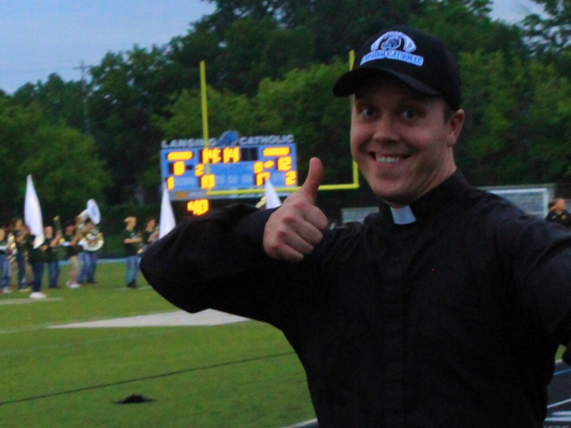 Did you know that all four Diocese of Lansing high schools have full-time chaplains? It's an incredible blessing. Deo gratias! At Lansing Catholic High School that man is Father Joe Campbell.
