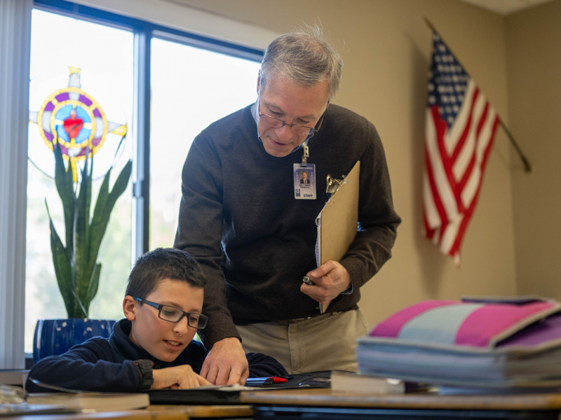 In practice, St. Mary incorporates distinct teaching methods in service of that goal: Latin (even preschoolers are introduced to nursery rhyme-style Latin songs in the full day program); and the Socratic method, recitation and narration — the practice of students retelling in their own words what they’ve learned, either verbally or, in older grades, in written form. The curriculum is modeled around the Trivium, a term that refers to what classical educators consider the grammar (kindergarten through fourth grade), logic (fifth through eighth grade), and rhetoric (ninth through 12th grade) stages. In short, early elementary at St. Mary is a time for giving students the building blocks, or grammar, of their subjects, while middle school is a time to start learning how to arrange that information through analytical thinking.
