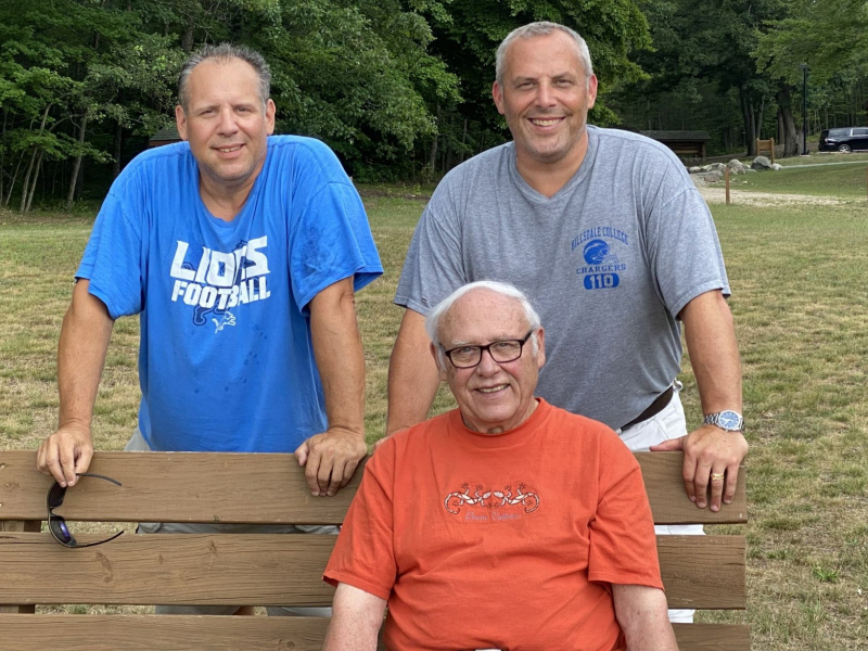 * Photograph below: Dad with orange shirt on bench. That's me and my brother Eric behind him. That's July of 2020 in Luther, MI at the College's Lodge.