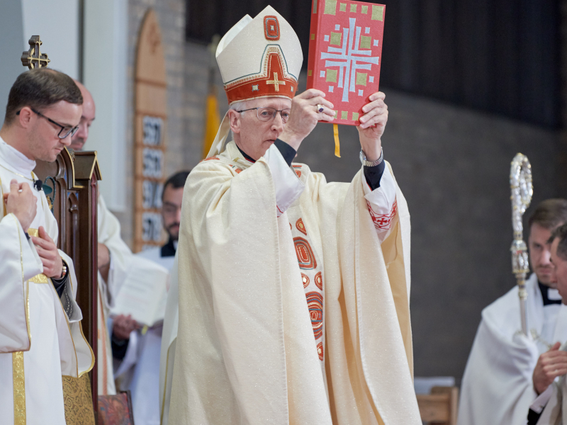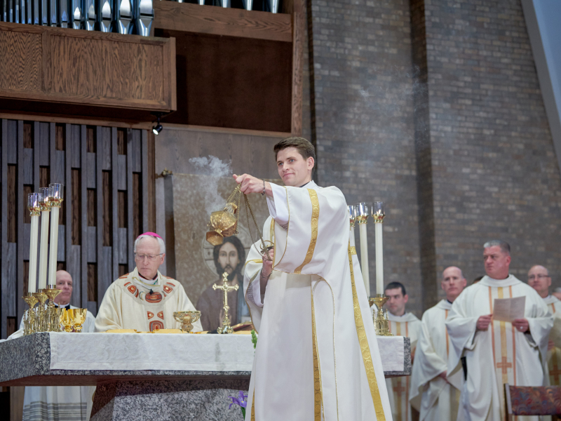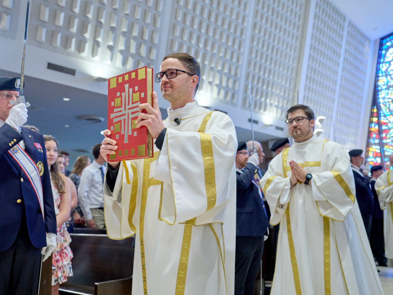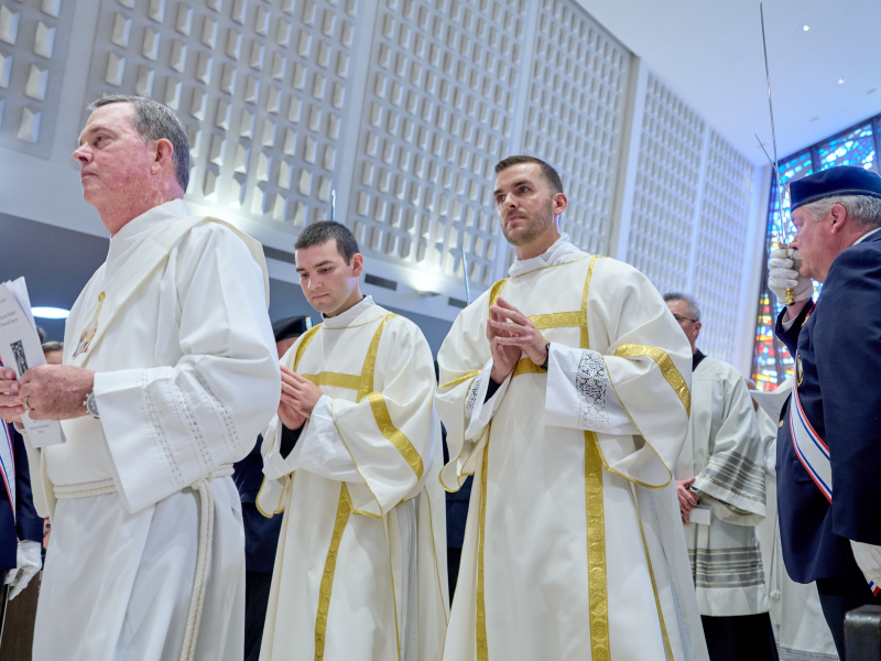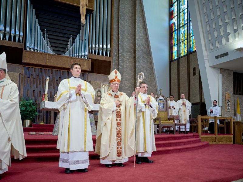 Thanks to: Bishop Mengeling; Fr. Gordon Riegle and the St. Thomas-St. John Staff. We welcome Archbishop Timothy Broglio of the Military Ordinariate, Very Reverend Jonathan of St. John Vianney Seminary, and Very Reverend Stephen Burr and Rev. Charles Fox of Sacred Heart Major Seminary, Fr. Vincent Ferrer Bagan, OP, of the North American College, and the many priests and fellow students from the various seminaries. Many thanks to Jeremy Priest and our MCs and serving team; Fr. John Whitlock and Denise Dell-Acqua and all those involved in making our celebration possible, including our musicians. We salute parents and family members of those to be ordained—welcome and thank you for your support of their vocations; invite all the seminarians present to stand; invite all the deacons and priests to stand.