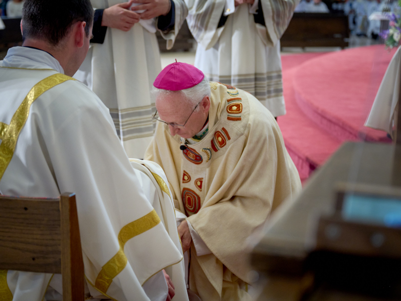 Jesus’ total love of the Father, his being a sign of the inbreaking of the Kingdom of Heaven, his clear missionary life, and his manifestation of the Spirit of God now become your calling and your life. You who, as deacons, are conformed to Christ the Servant, and you who, as priests, are conformed to Christ as Head and Shepherd, are all called to serve as he served. This is as true as St. Paul tells us today: “we do not preach ourselves but Jesus Christ as Lord, and ourselves as your slaves for the sake of Jesus.” That is the kind of loving service to which we are called. That is what it means for you Priests to be Fathers, and you Deacons to be Servants, all of you to be rooted in Christ and filled with his hope. This you will be for the many you serve. Now, allow me to be a weak and sinful example to you as I seek to serve you who are to be ordained priests and to wash your feet.