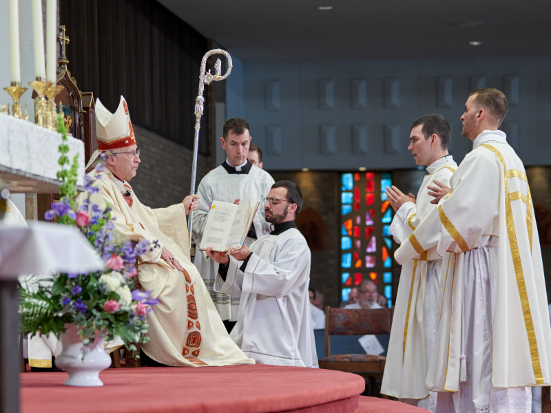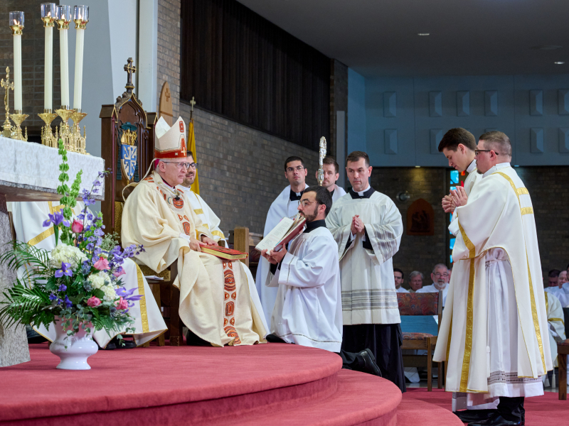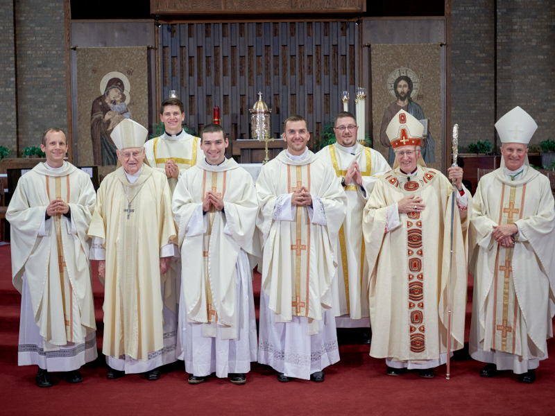 “He has loved us as a celibate, a love which is pure grace, and so, with God’s grace, are we dedicated to love in this same way,” said Bishop Boyea to Deacons Tyler Arens and Peter Ludwig moments prior to their ordination to the sacred priesthood, June 11, and to seminarians Corey Bilodeau and Shea Kettner as they prepared for ordination to the transitional diaconate.