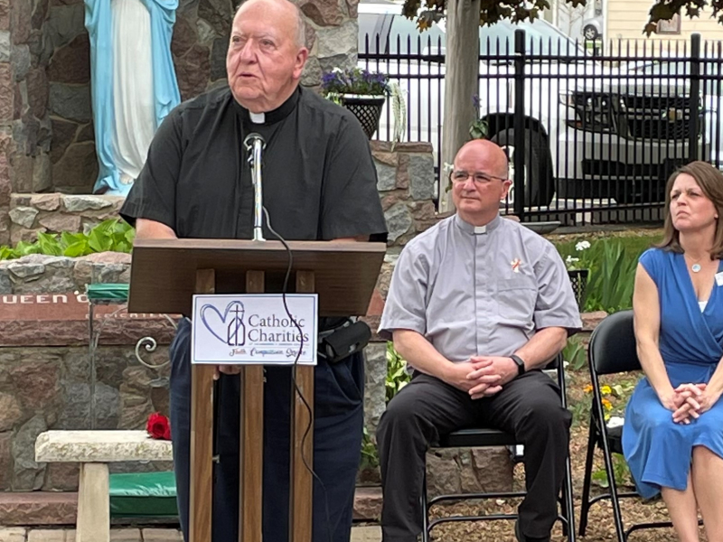 Katie Baxter gave those present an explanation of the Flint statue which depicts Our Lady of Beauraing, an approved apparition of the Blessed Virgin Mary to children in Belgium in 1932. The statue was recently restored by Sharron and Winston Dolphin by way of a donation to Catholic Charities.