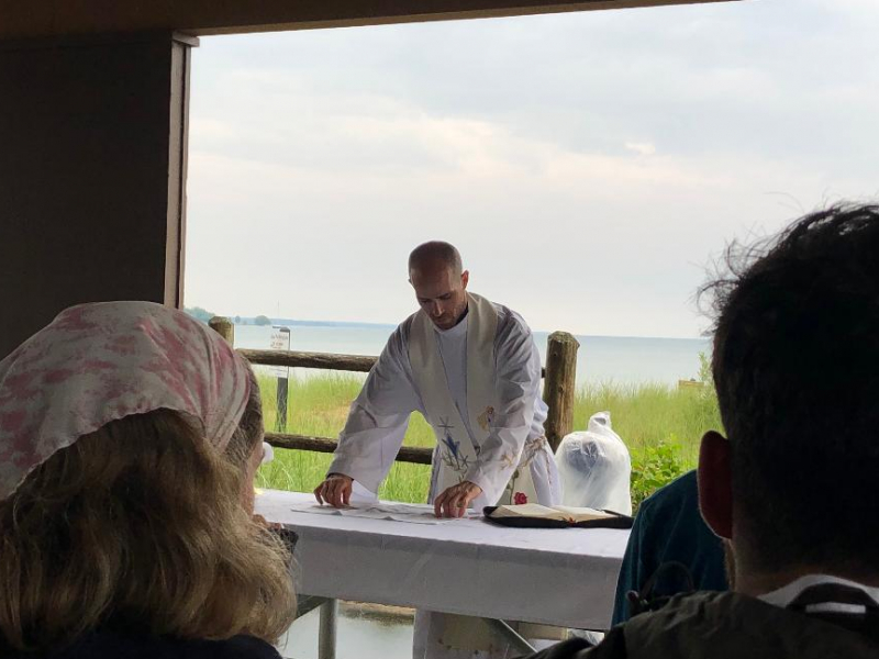 “After prayer at the Cross in the Woods, we bussed it back to Cheboygan State Park to have an amazing pulled-pork dinner on the beach pavilion as some of us then went in Lake Huron to wash off and watch the sun set over the water before heading back for our final bonfire and reflections and prayer of the day. Sunday morning, we finished our time together by returning to the Cross in the Woods for their outdoor Mass. We thank the Lord for his many blessings individually as well as collectively experienced. We pray that the blessings of the weekend continue in the lives of the pilgrims and strengthen them in their faith.”
