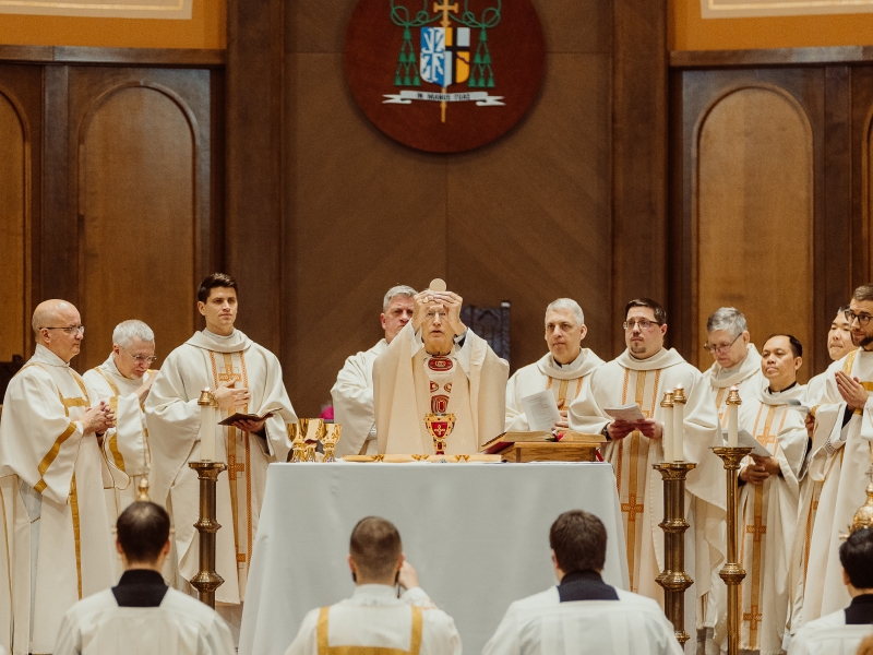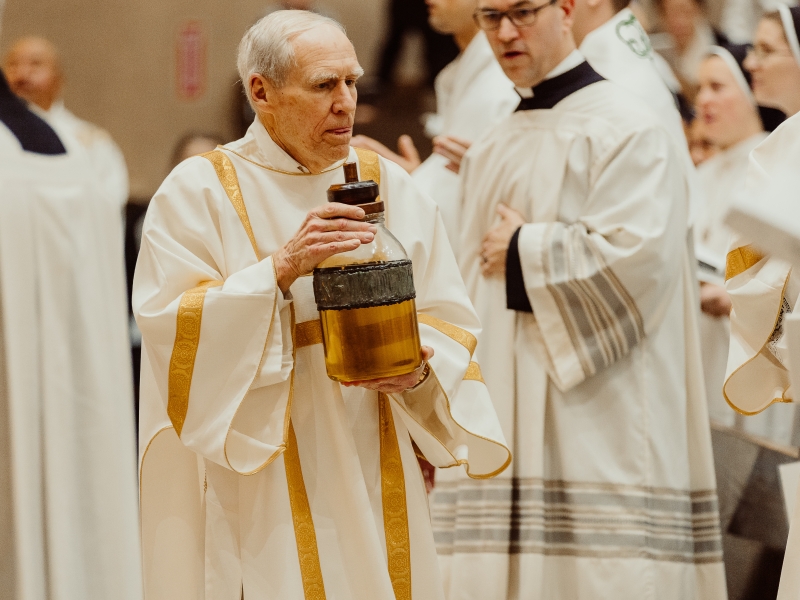 The annual Chrism Mass traditionally occurs upon the morning of Holy Thursday. The concelebration of Holy Mass by the priests of the diocese is an expression of their communion with their bishop. During the sacred liturgy, the diocesan priests also renew their priestly promises.