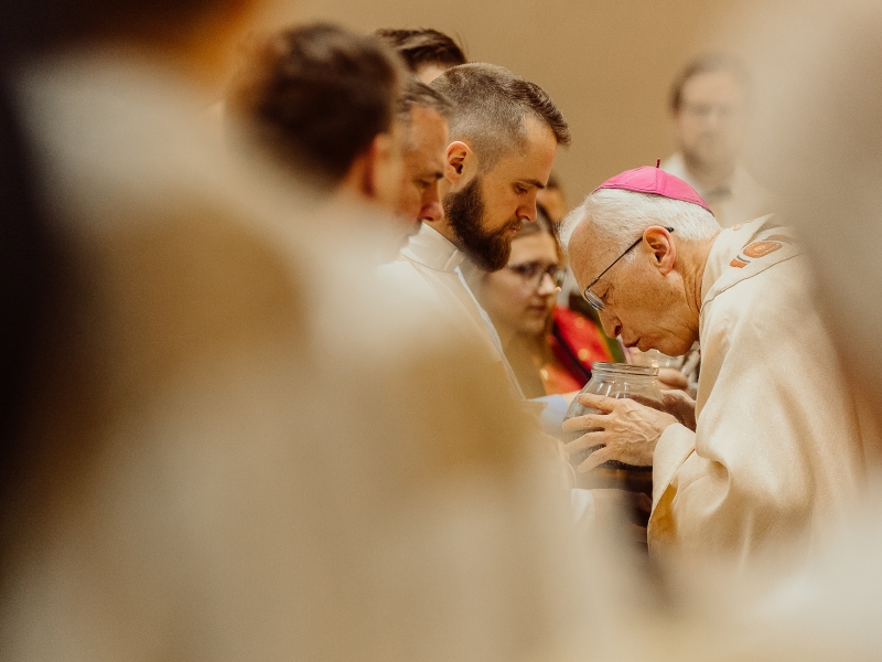 Today’s Chrism Mass also saw Bishop Boyea consecrate the three holy oils that will be used in parishes across the Diocese of Lansing in the year ahead. The oil of chrism is used to anoint the newly baptized, to seal the candidates for confirmation, and to anoint the hands of presbyters and the heads of bishops at their ordination, as well as in the rites of anointing pertaining to the dedication of churches and altars. The oil of catechumens is used in the preparation of the catechumens for their baptism. The oil of infirmorum is used to bring comfort and support to the sick in their infirmity.